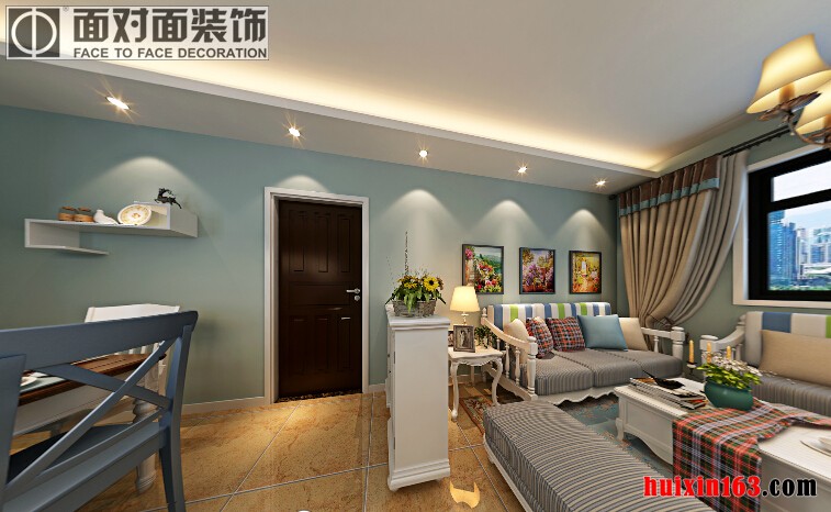 在客厅两堵比较长的墙面的顶端上面设计了两条平行的灯带,在灯带的下面点缀了很多明亮的射灯,在客厅顶面中央的位置悬挂一盏复古田园风格的吊灯,营造出温馨自然的氛围。白色实木框架的沙发,搭配白色的茶几和电视柜,空间的家居整体上比较统一。沙发背景墙上采用的是淡蓝色的墙漆,搭配一些黑色简约画框装饰的闲言的自然景物的图画,营造出浓郁的乡村田园的气息。