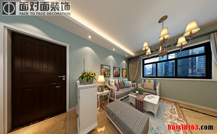 在客厅两堵比较长的墙面的顶端上面设计了两条平行的灯带,在灯带的下面点缀了很多明亮的射灯,在客厅顶面中央的位置悬挂一盏复古田园风格的吊灯,营造出温馨自然的氛围。白色实木框架的沙发,搭配白色的茶几和电视柜,空间的家居整体上比较统一。沙发背景墙上采用的是淡蓝色的墙漆,搭配一些黑色简约画框装饰的闲言的自然景物的图画,营造出浓郁的乡村田园的气息。