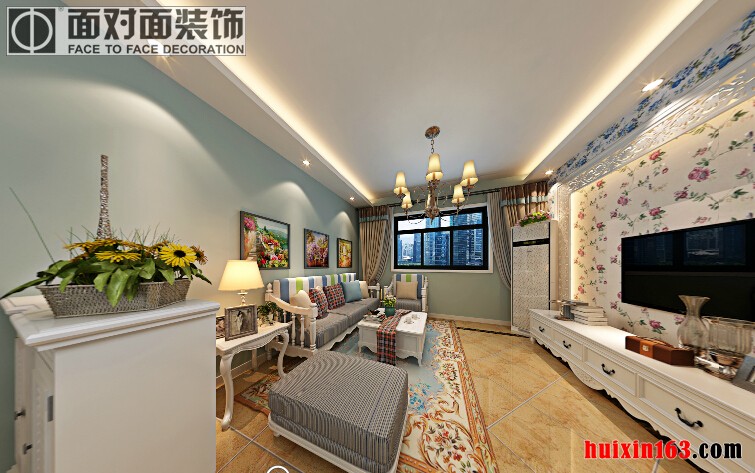 在客厅两堵比较长的墙面的顶端上面设计了两条平行的灯带,在灯带的下面点缀了很多明亮的射灯,在客厅顶面中央的位置悬挂一盏复古田园风格的吊灯,营造出温馨自然的氛围。白色实木框架的沙发,搭配白色的茶几和电视柜,空间的家居整体上比较统一。沙发背景墙上采用的是淡蓝色的墙漆,搭配一些黑色简约画框装饰的闲言的自然景物的图画,营造出浓郁的乡村田园的气息。