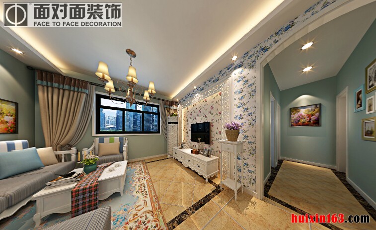 在客厅两堵比较长的墙面的顶端上面设计了两条平行的灯带,在灯带的下面点缀了很多明亮的射灯,在客厅顶面中央的位置悬挂一盏复古田园风格的吊灯,营造出温馨自然的氛围。白色实木框架的沙发,搭配白色的茶几和电视柜,空间的家居整体上比较统一。沙发背景墙上采用的是淡蓝色的墙漆,搭配一些黑色简约画框装饰的闲言的自然景物的图画,营造出浓郁的乡村田园的气息。