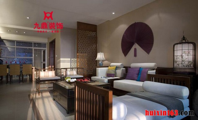 简洁大方石膏板吊顶,为了营造古雅静谧的氛围,以射灯代替主灯,灯光柔和且明亮,有台灯搭配,可满足生活用光需要。浅色墙漆粉饰沙发背景墙,与吊顶形成一定的对比度,突显层次,挂壁折扇装饰品装饰背景墙,古雅别致。实木结构框架沙发,白色靠背、坐垫及扶手,看上去清新淡雅、简洁舒适,一尘不染。色彩靠枕装饰,缓解沙发刻板的印象,平衡色彩,调和家居艺术氛围,增添灵动之感。造型简约的中式木质座椅及无靠背沙发搭配,古风浓郁。方形实木茶几,体态厚重,浅金色线条装饰,不仅将茶几的格调提升了出来,也体现出了茶几的立体感,质朴自然,整个家居设计,儒雅隽秀,古色古香。